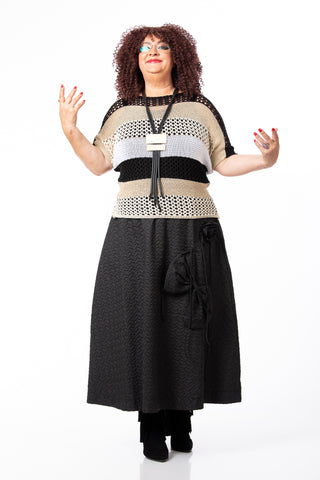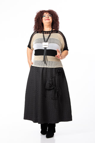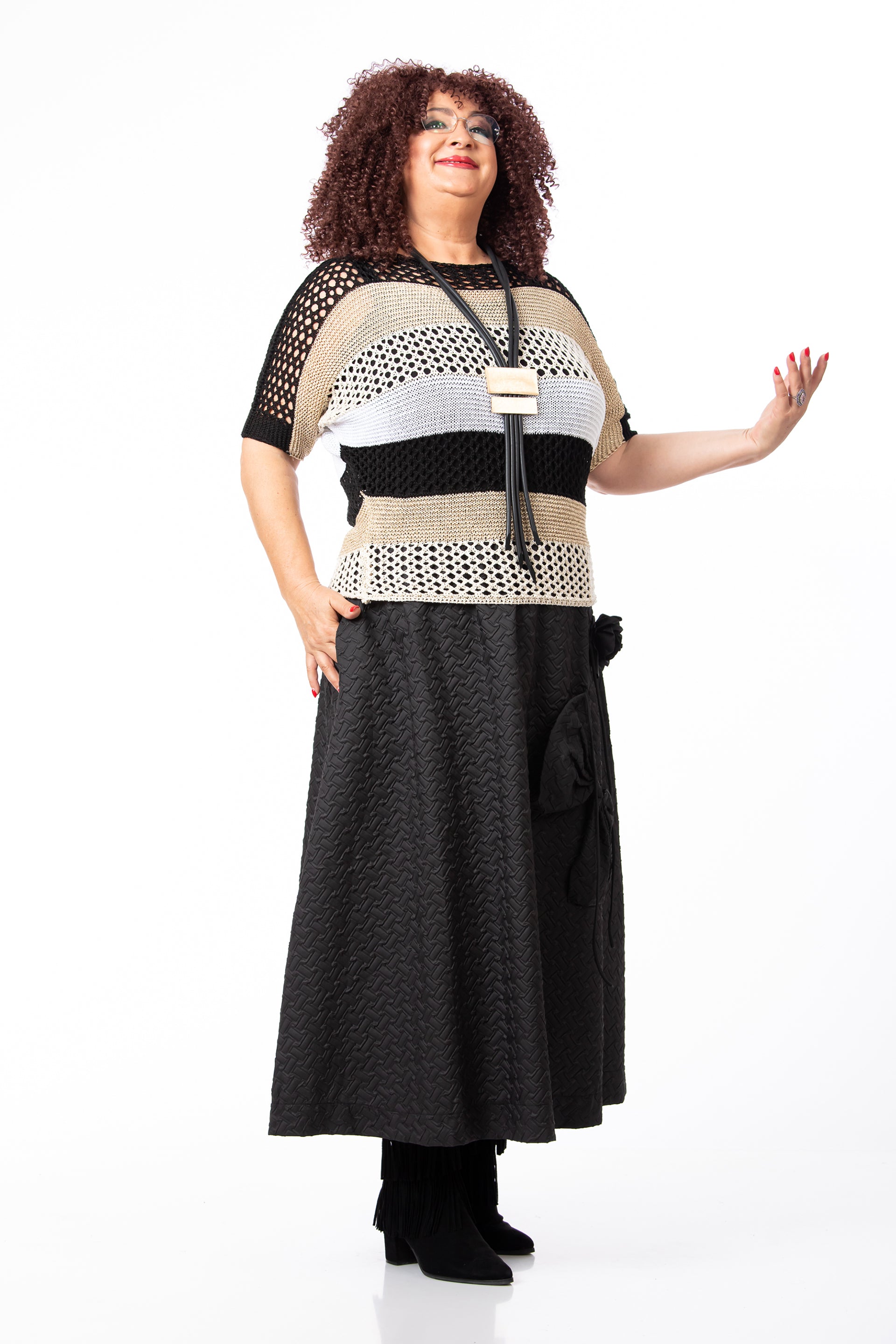 Fusta, confecționată din tricot tip Brocard ușor elastic, se simte foarte plăcut la atingere și asigură o purtare confortabilă. Designul rafinat este pus în valoare de textura tip Brocard, fiind completat de aplicații și accesorii subtile. Fusta este prevăzută cu buzunare practice și are elastic în talie, oferind o potrivire excelentă pentru o siluetă echilibrată și o ținută de înaltă clasă.