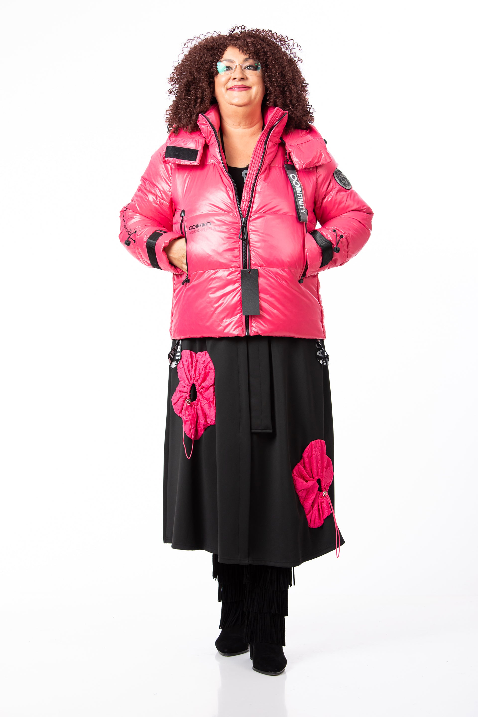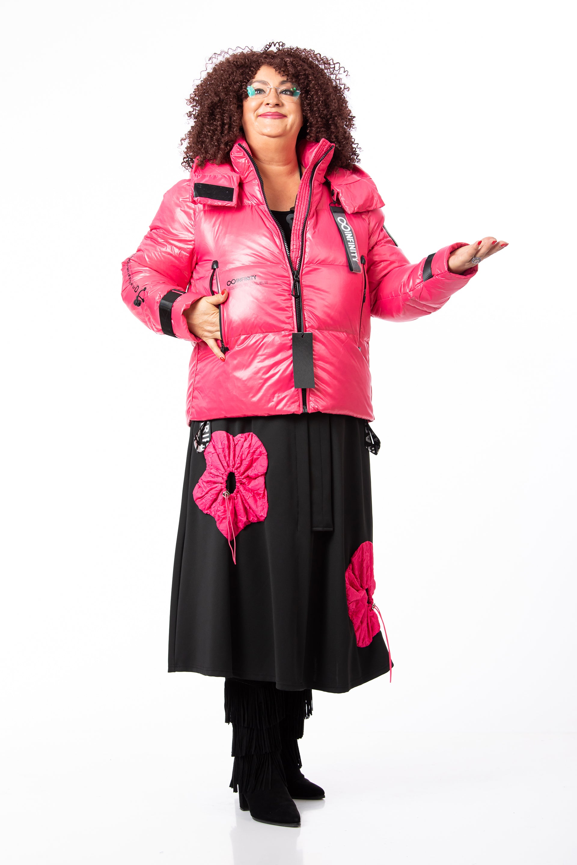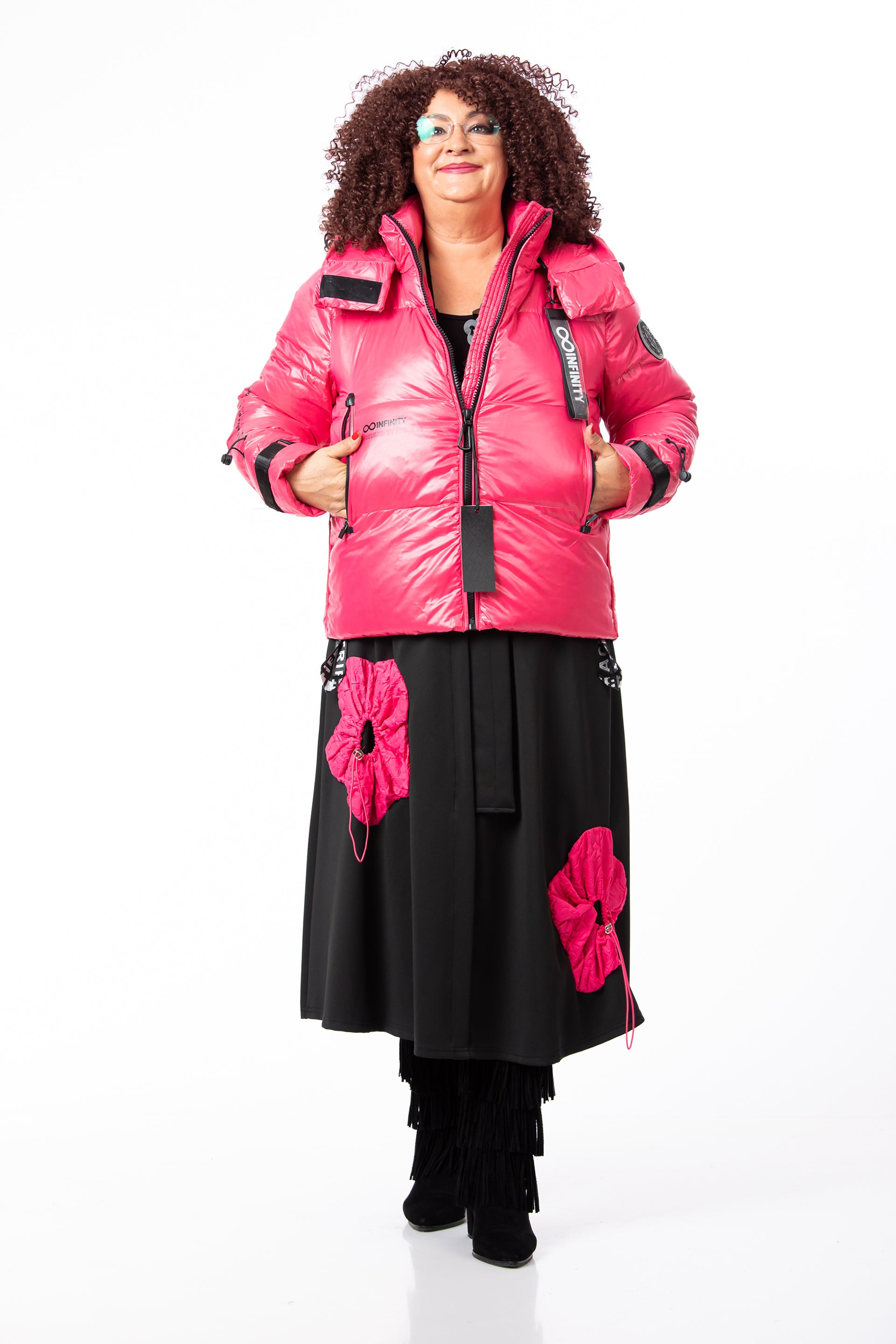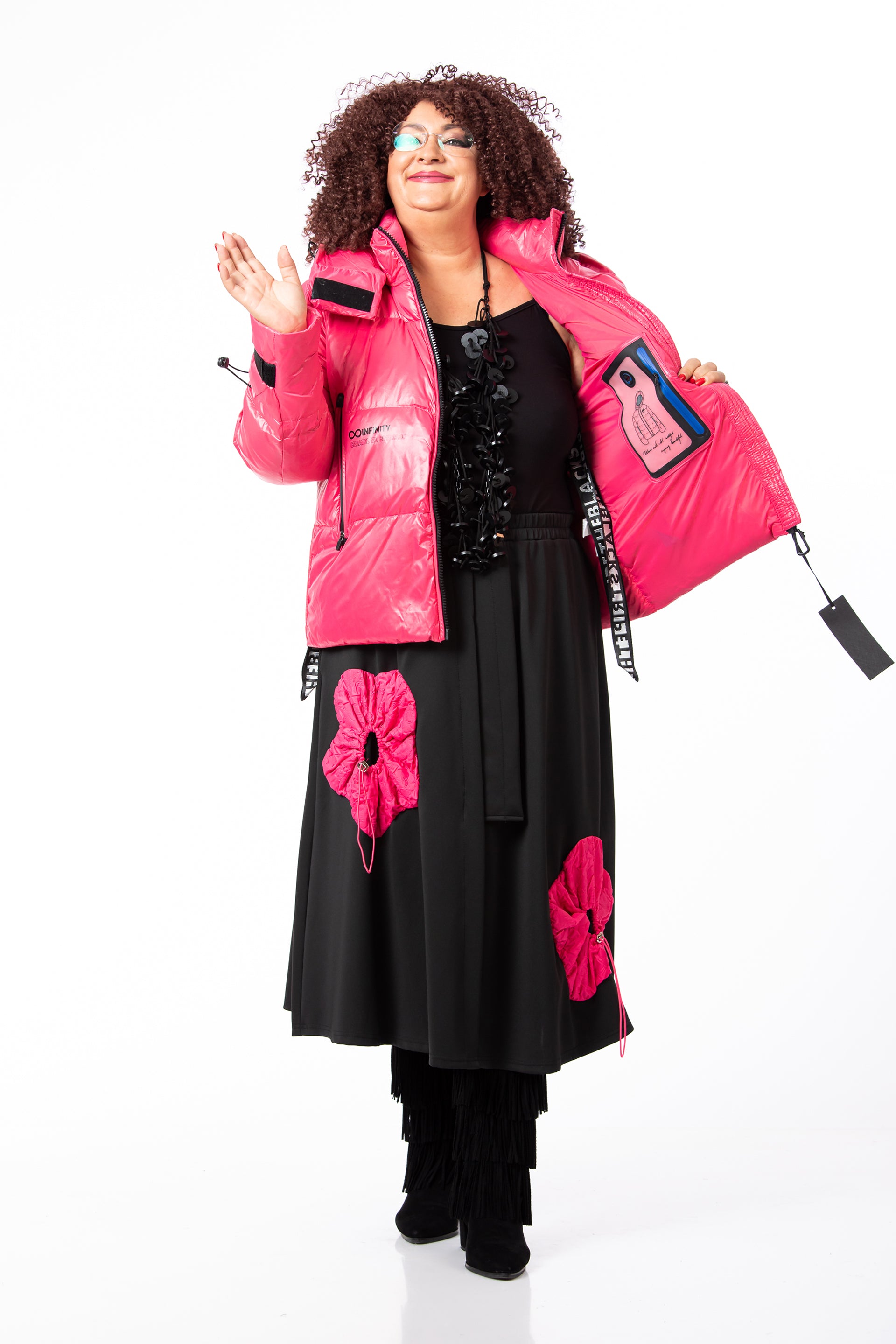 Fusta: Confecționată din jerseu elastic, un material plăcut la atingere care oferă libertate de mișcare. Designul este evidențiat de aplicații, buzunare și accesorii decorative.
