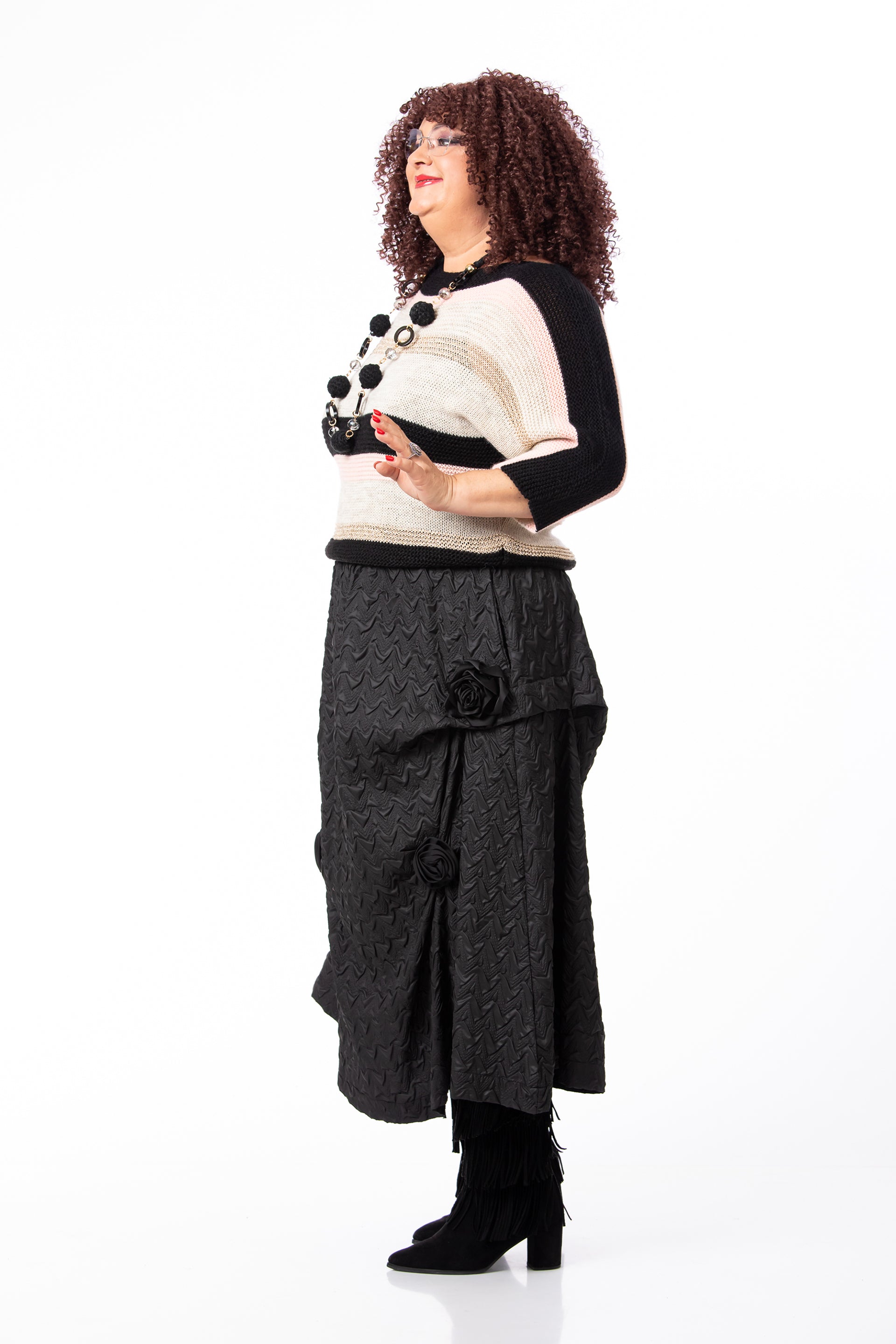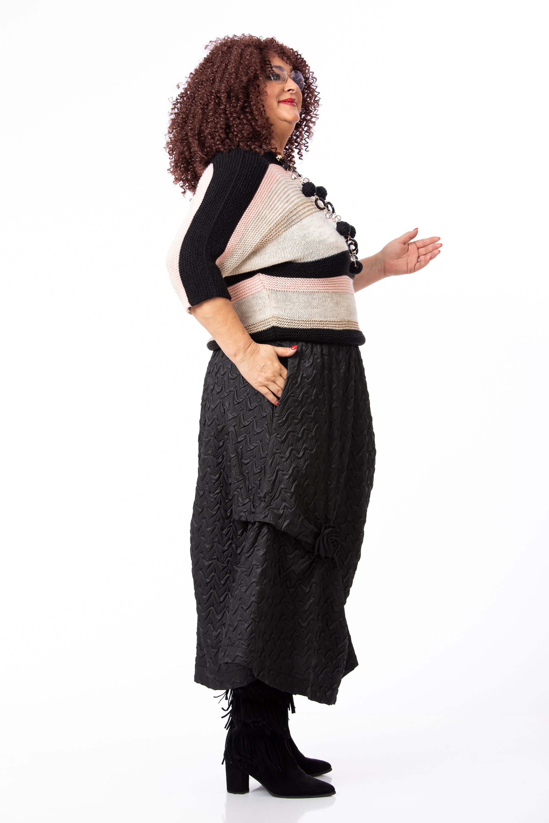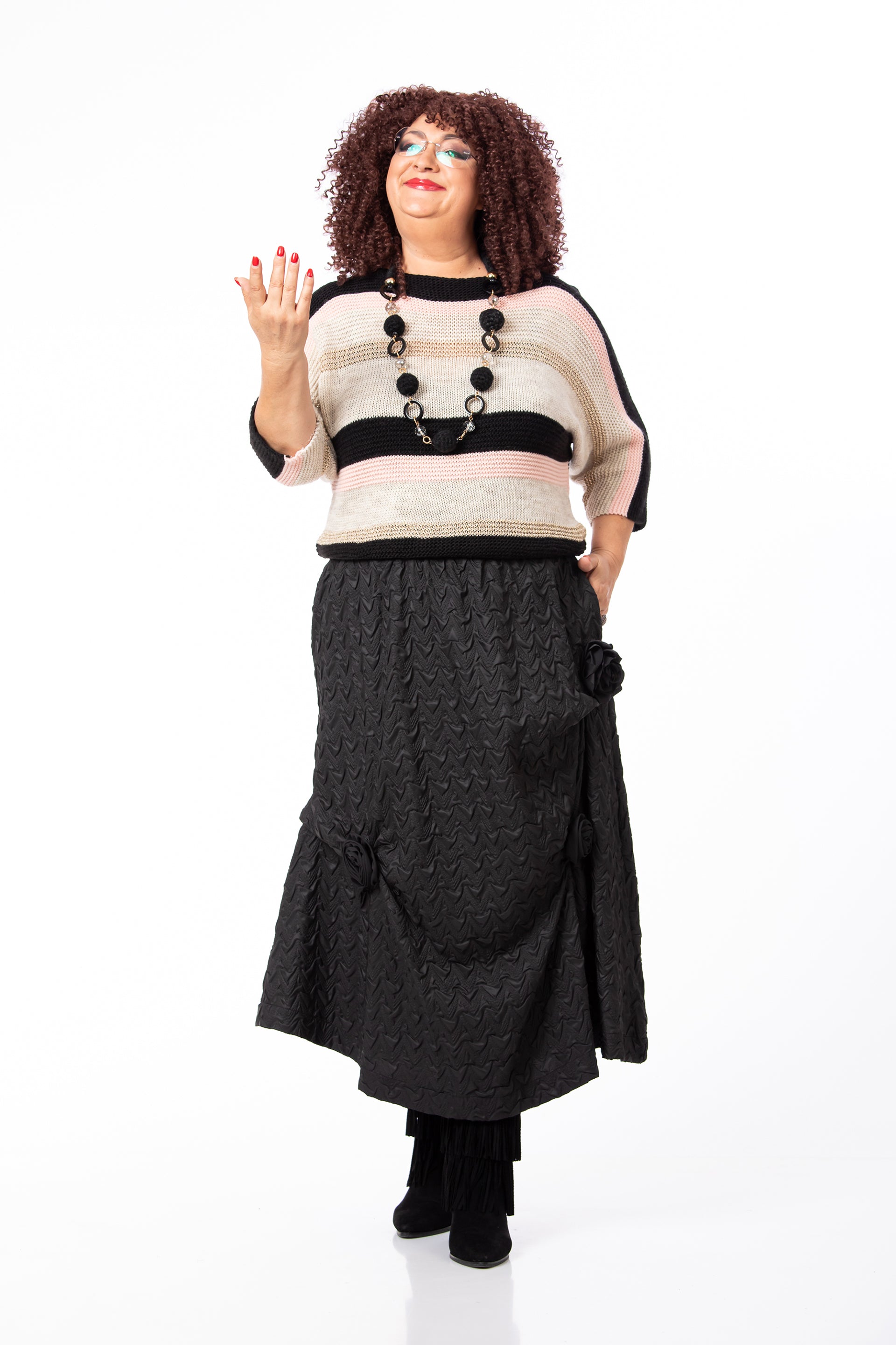 Fusta, confecționată din tricot tip Brocard ușor elastic, se simte foarte plăcut la atingere și asigură o purtare confortabilă. Designul rafinat este pus în valoare de textura tip Brocard, fiind completat de aplicații și accesorii subtile. Fusta este prevăzută cu buzunare practice și are elastic în talie, oferind o potrivire excelentă pentru o siluetă echilibrată și o ținută de înaltă clasă.