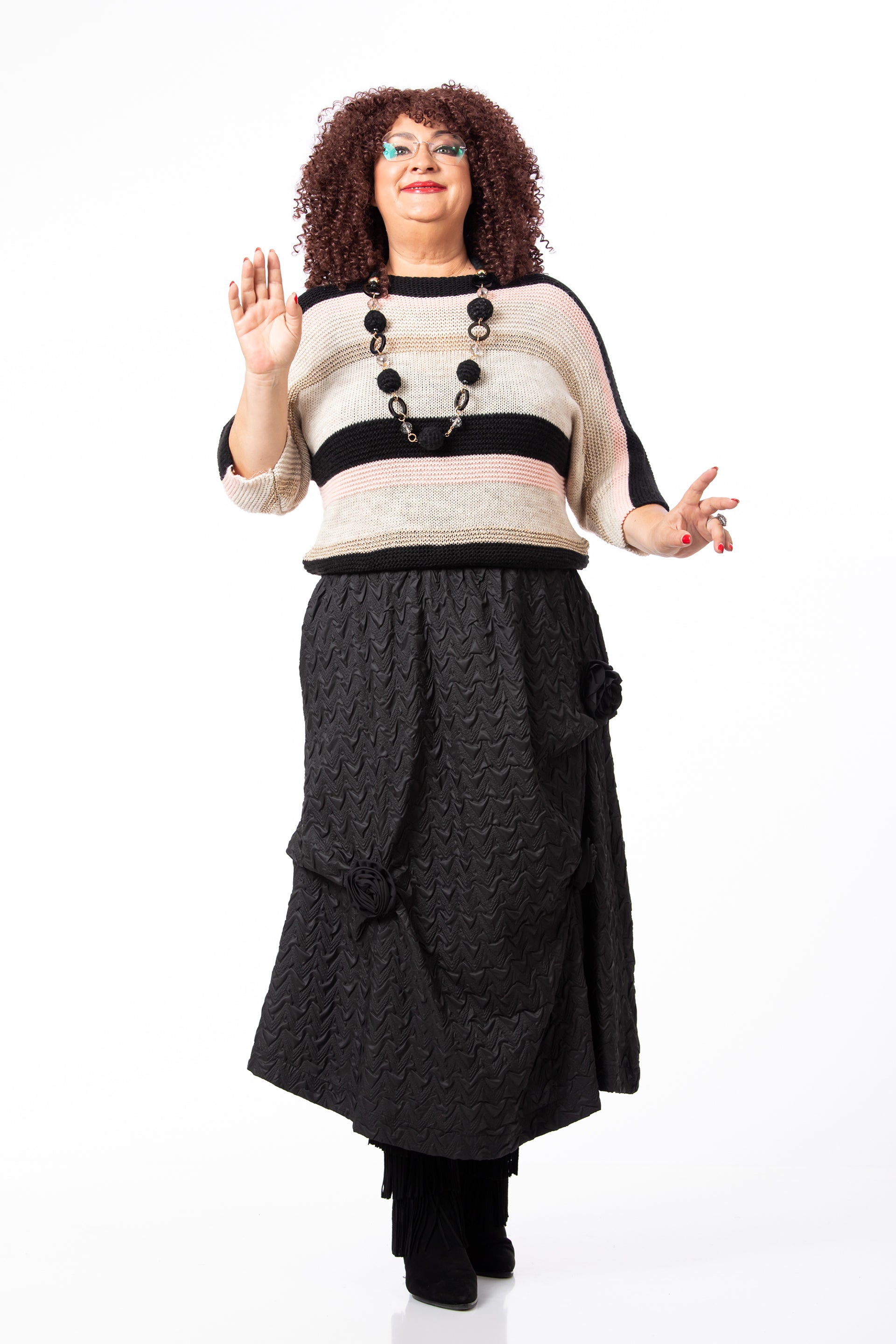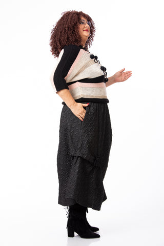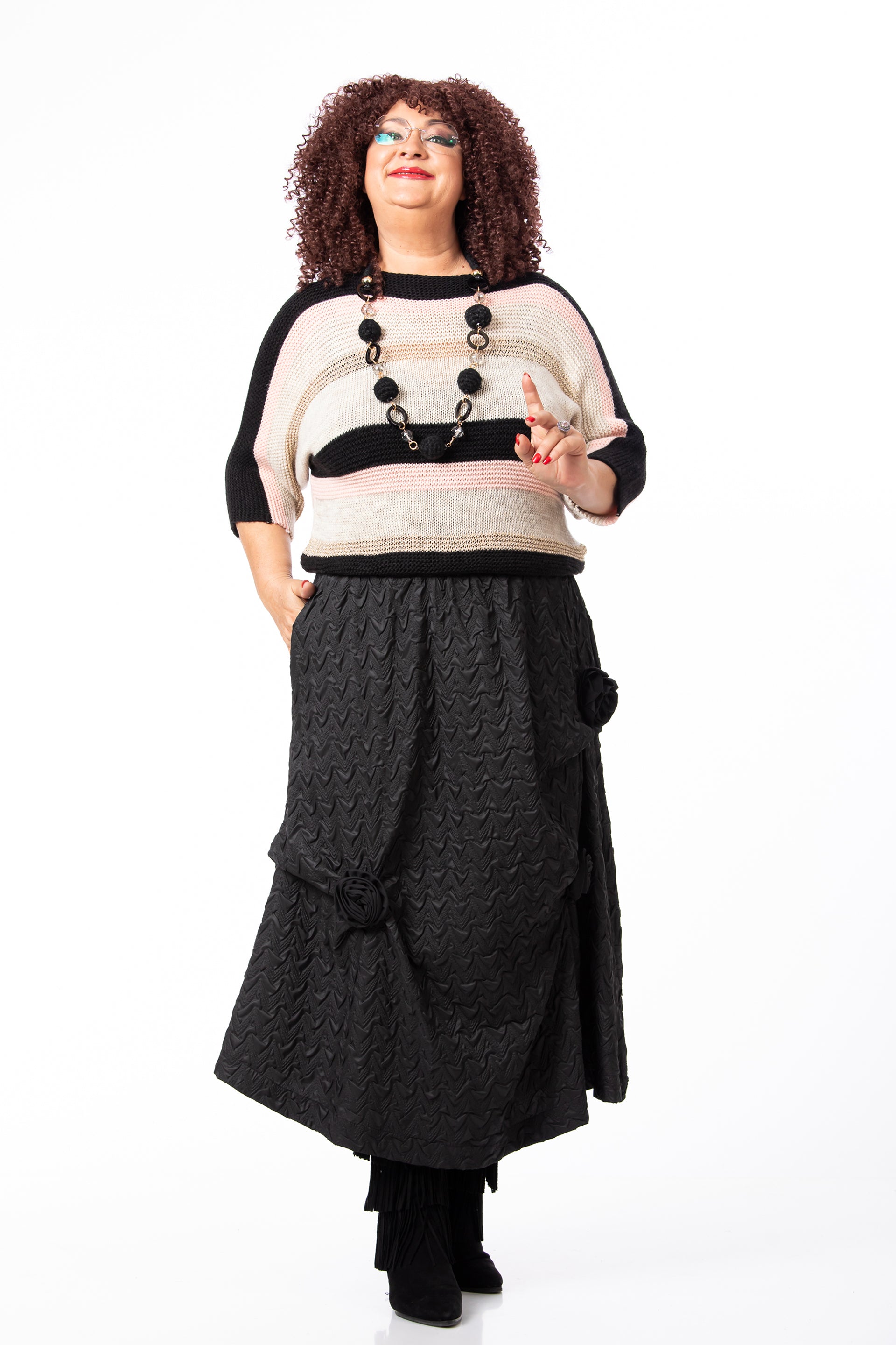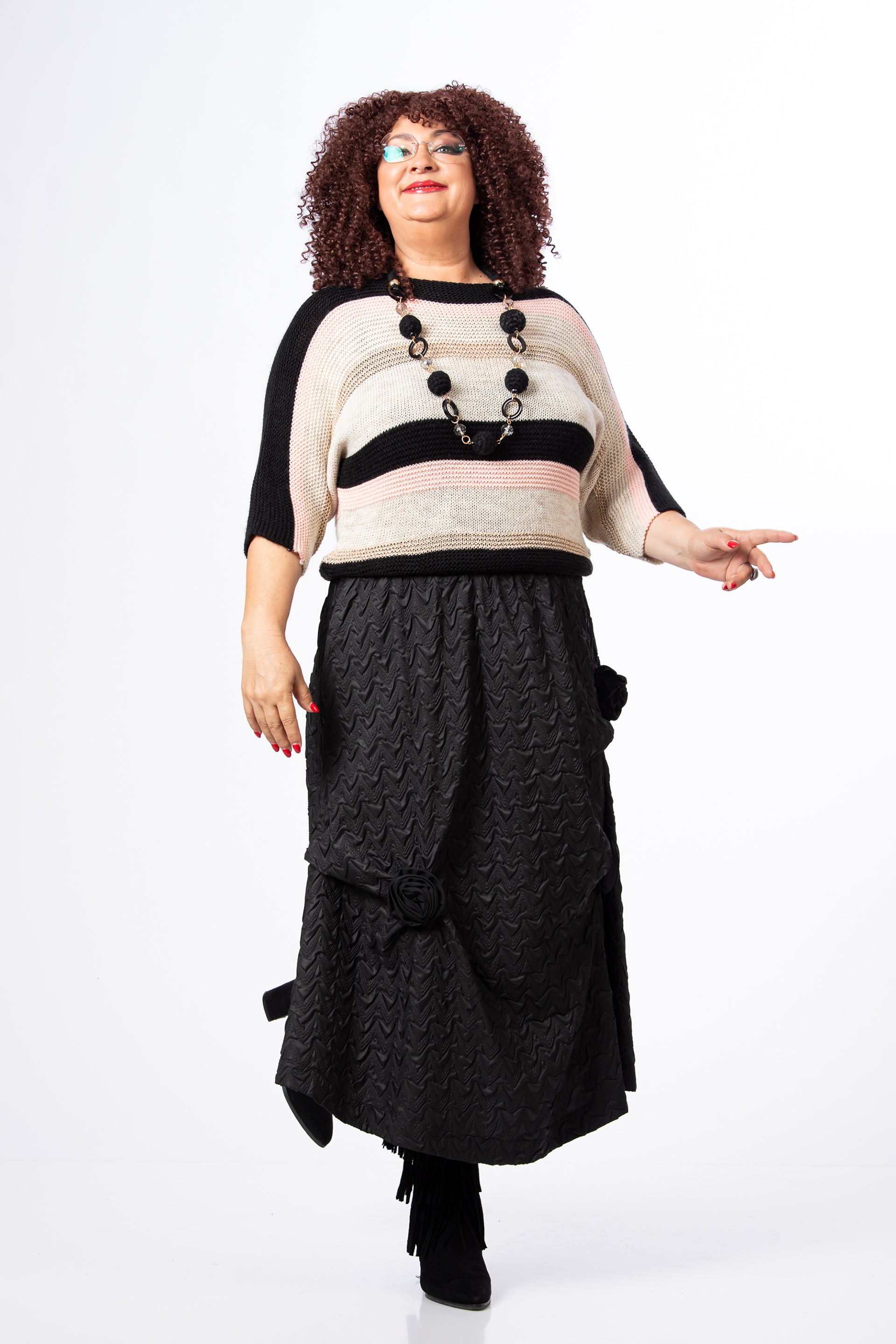 Fusta, confecționată din tricot tip Brocard ușor elastic, se simte foarte plăcut la atingere și asigură o purtare confortabilă. Designul rafinat este pus în valoare de textura tip Brocard, fiind completat de aplicații și accesorii subtile. Fusta este prevăzută cu buzunare practice și are elastic în talie, oferind o potrivire excelentă pentru o siluetă echilibrată și o ținută de înaltă clasă.