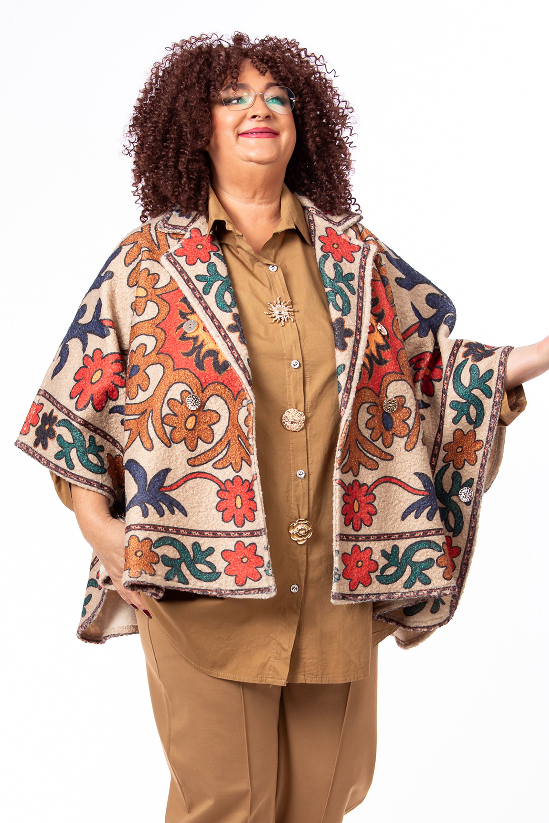 Material: Realizat din stofă Bucle (o țesătură deosebită, cu aspect buclat), care oferă căldură și o notă distinctivă de rafinament.