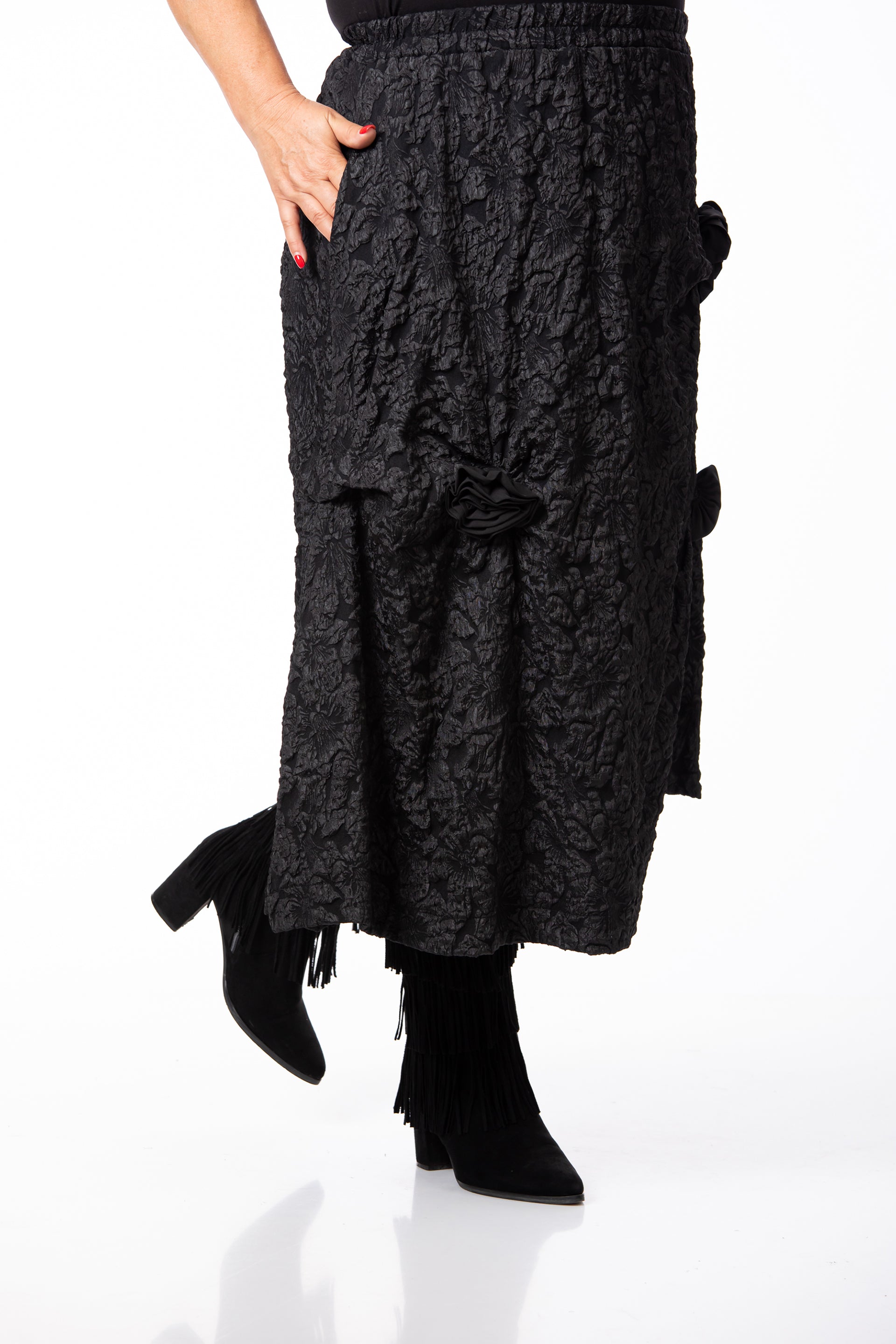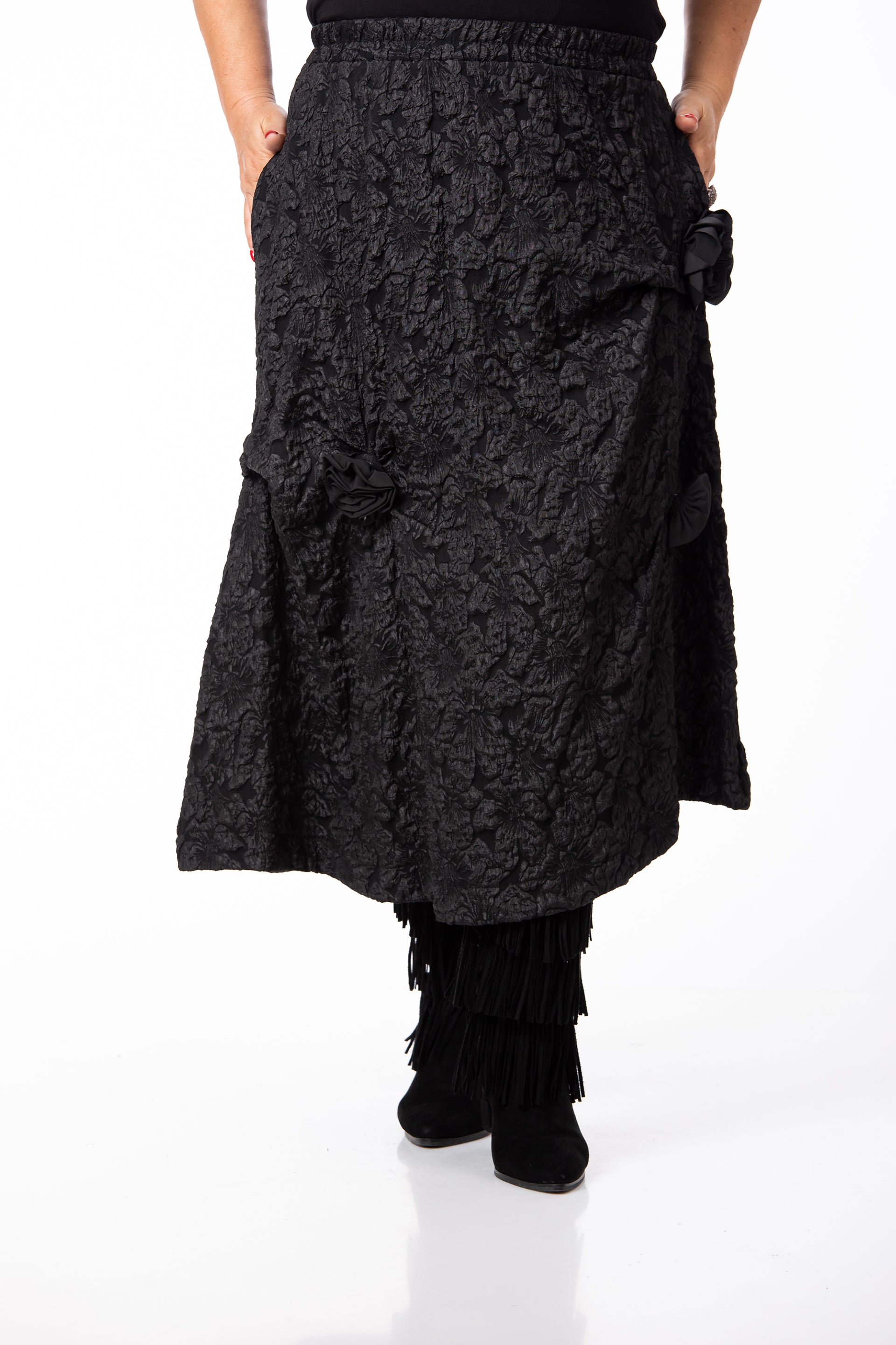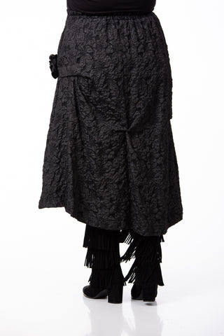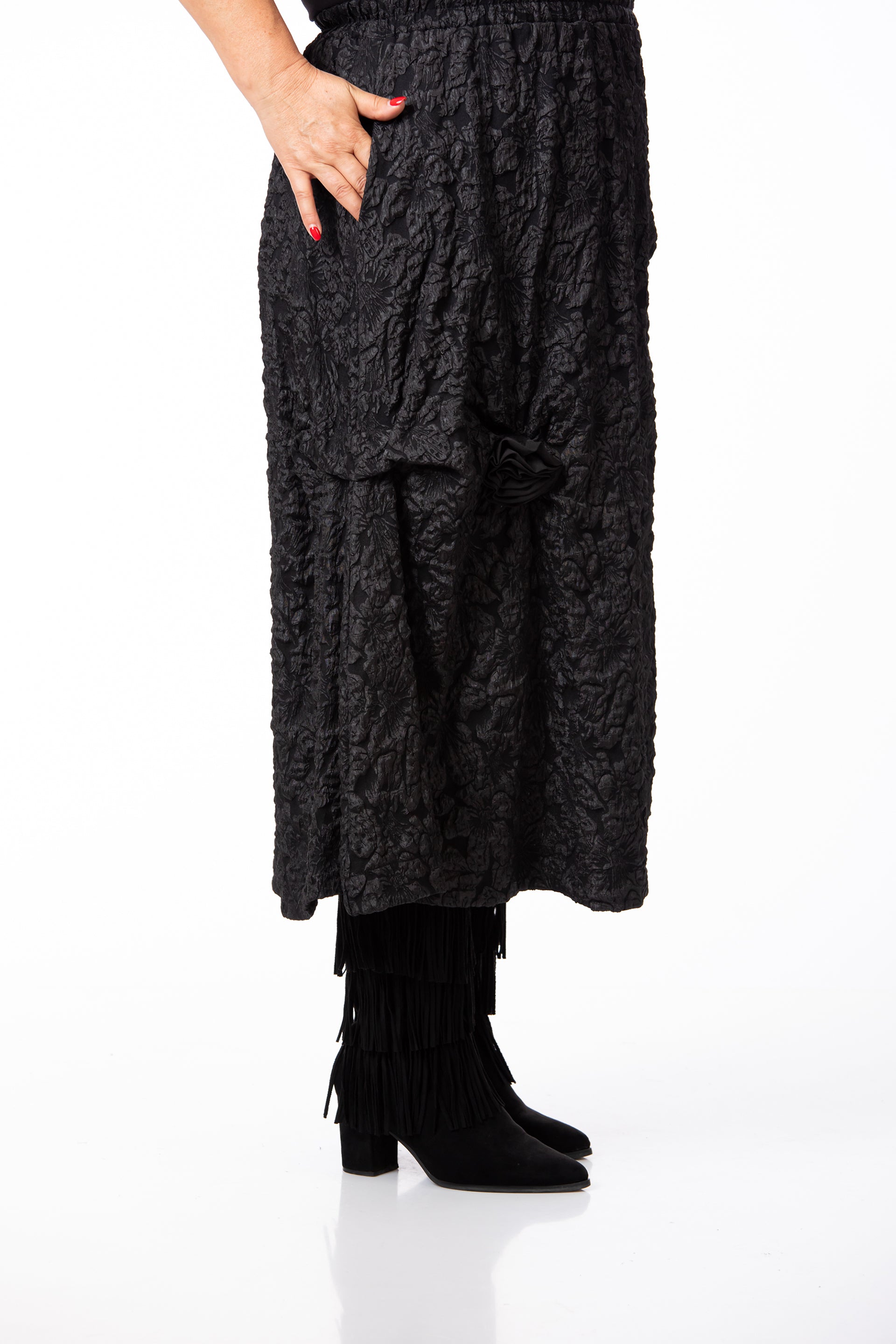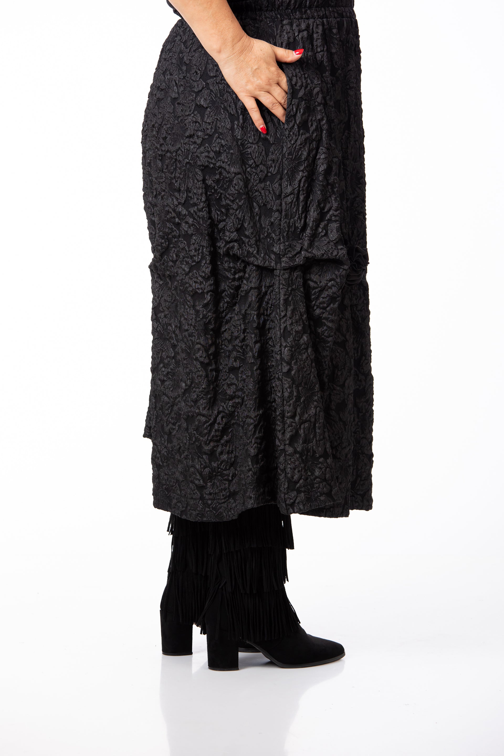 Designul rafinat este pus în valoare de textura tip Brocard, fiind completat de aplicații și accesorii subtile. Fusta este prevăzută cu buzunare practice și are elastic în talie, oferind o potrivire excelentă pentru o siluetă echilibrată și o ținută de înaltă clasă. Datorită versatilității și detaliilor sale, este potrivită pentru o diversitate mare de evenimente.