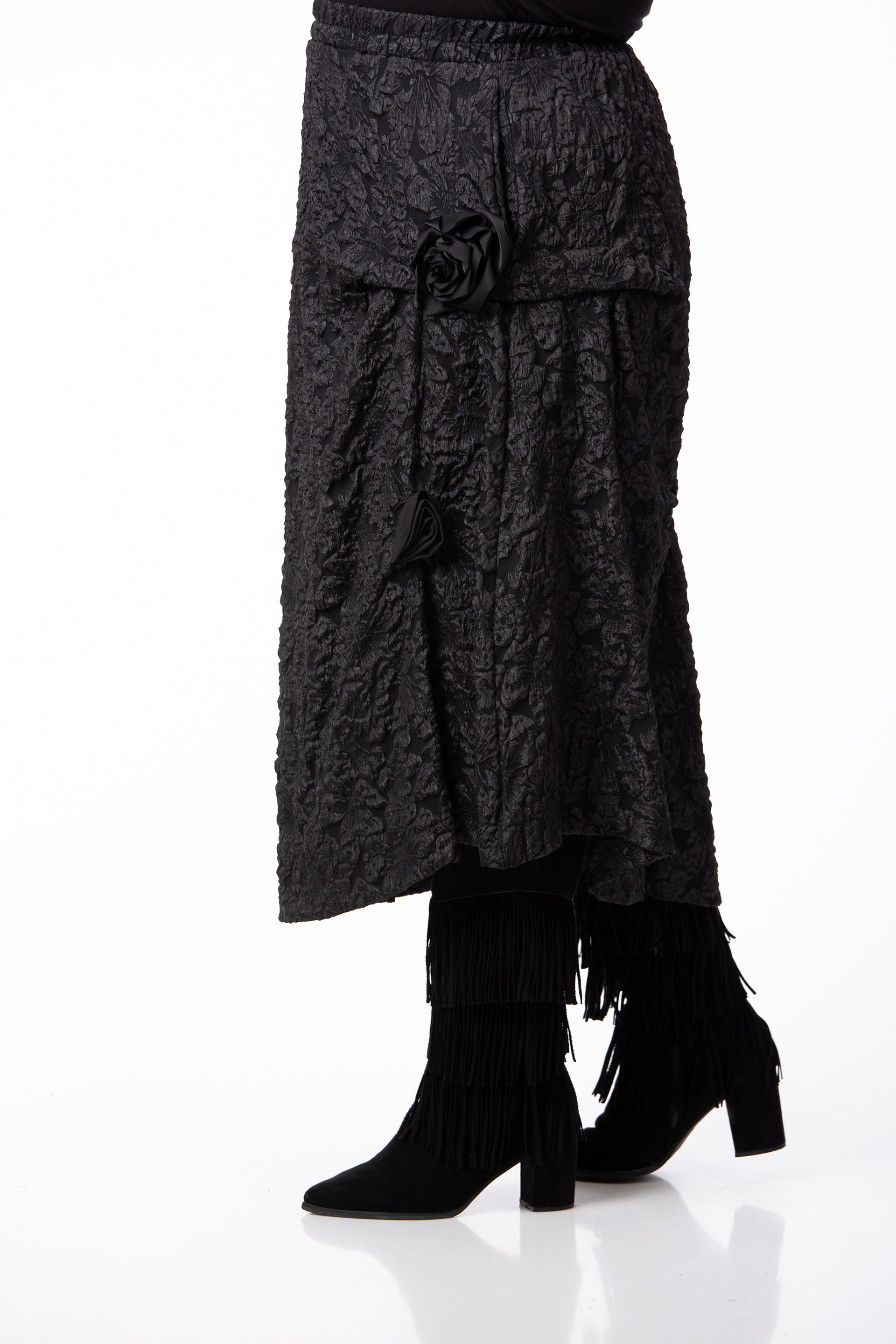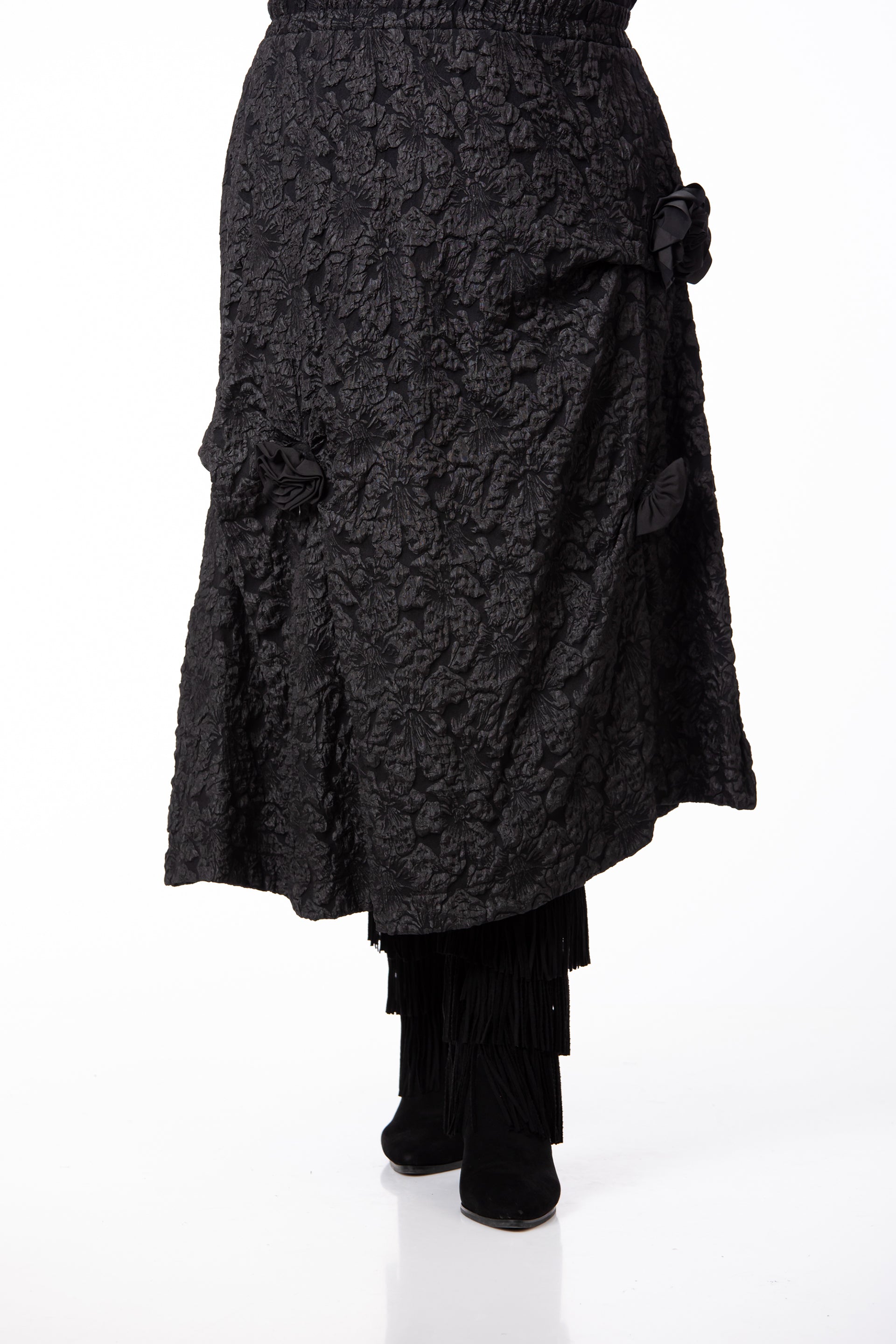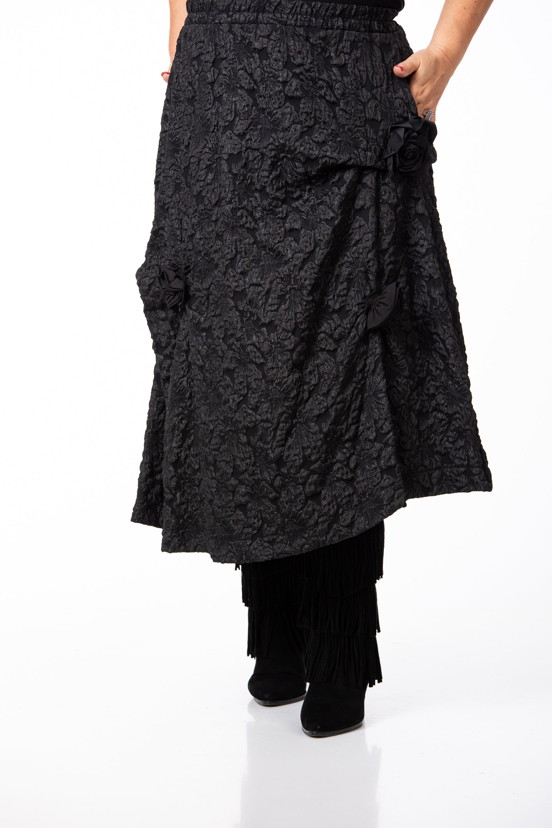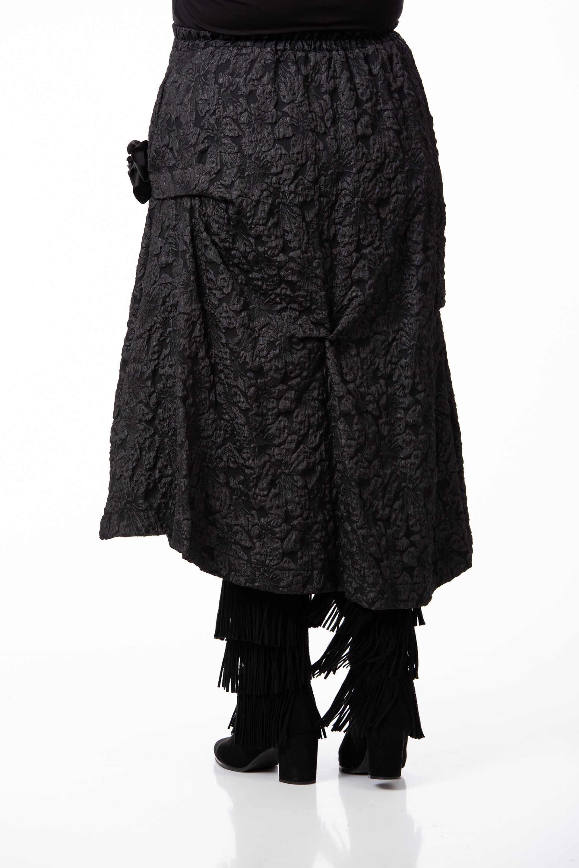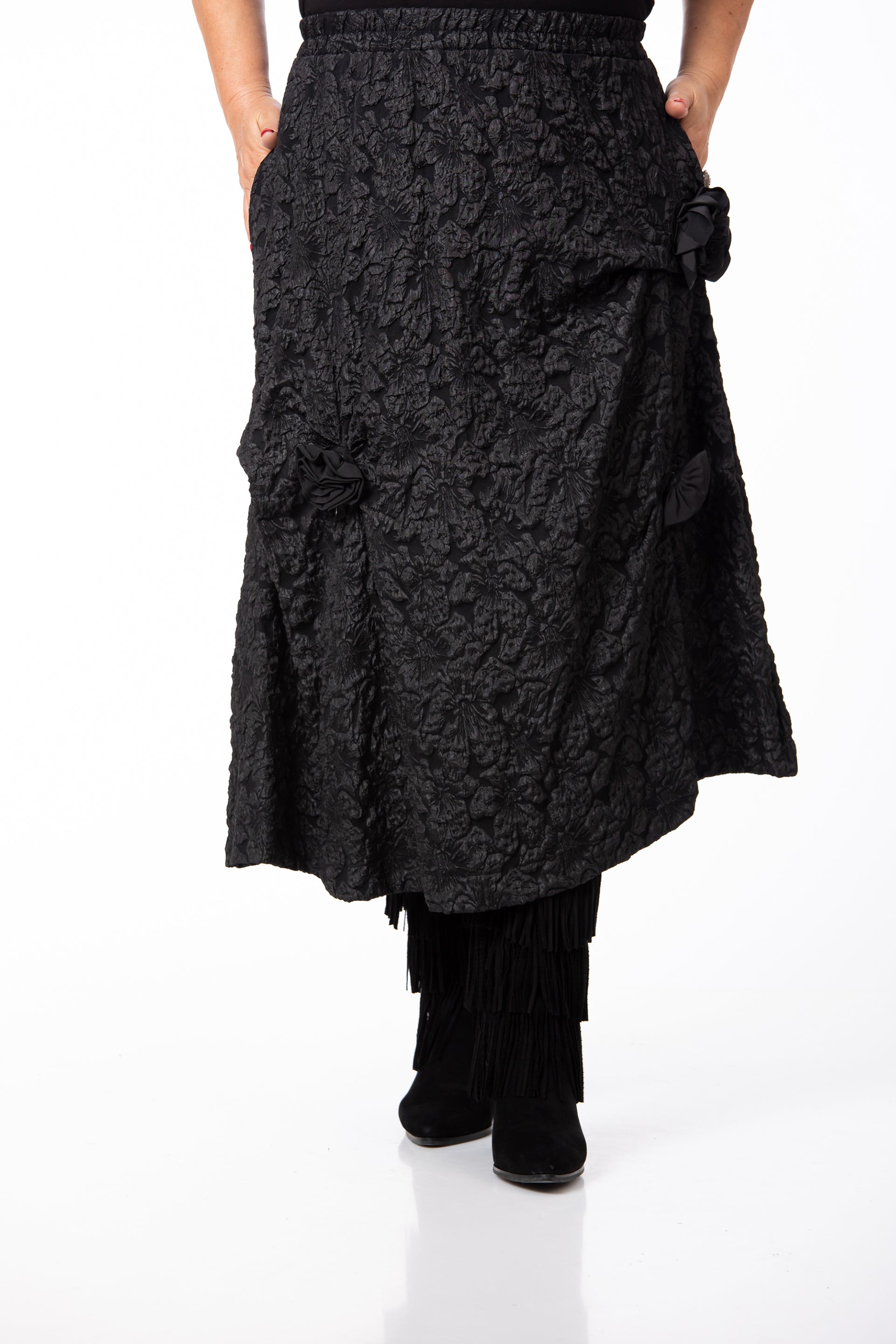 Designul rafinat este pus în valoare de textura tip Brocard, fiind completat de aplicații și accesorii subtile. Fusta este prevăzută cu buzunare practice și are elastic în talie, oferind o potrivire excelentă pentru o siluetă echilibrată și o ținută de înaltă clasă. Datorită versatilității și detaliilor sale, este potrivită pentru o diversitate mare de evenimente.