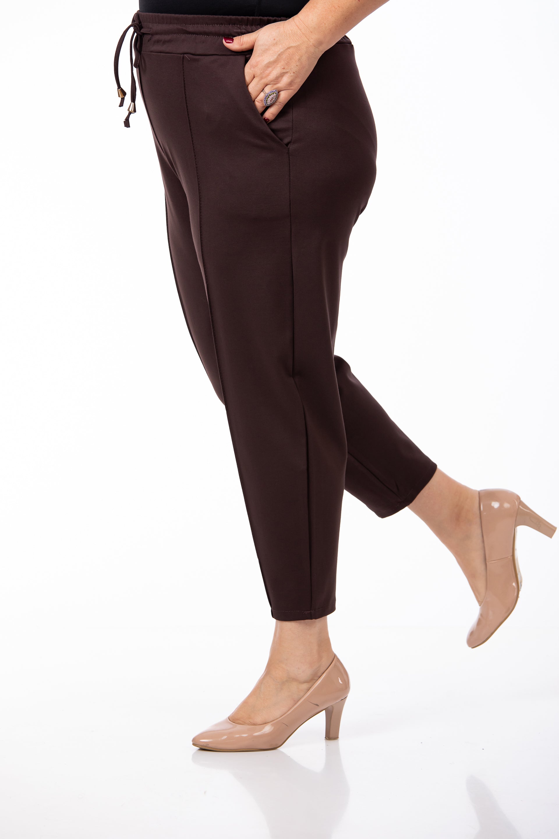 • Detalii: Dungă în față, buzunare, elastic și șnur în talie
